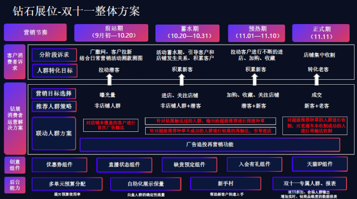 在双11当天的目标是成交,所以新客、老客、收藏加购过的、反复游览的、之前成交的,对超级推荐种草的人群进行收割,或者对直通车人群进行再次触达。